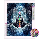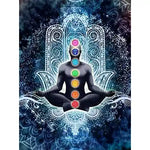 Ce motif de peinture diamant affiche une silhouette en tailleur dans une posture de méditation parfaitement centrée. Les sept chakras s'illuminent le long du corps, du coccyx jusqu’au sommet de la tête. Idéale pour apporter une ambiance zen à un espace dédié à la détente et au bien-être.
