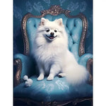 Ce diamond painting met en scène un spitz blanc, assis avec élégance sur un somptueux fauteuil de style Louis XVI. Le contraste entre la fourrure blanche du spitz et le velours teinté de bleu du fauteuil crée une esthétique visuellement captivante. La tapisserie assortie ajoute une touche de sophistication à l'ensemble, mettant en valeur la noblesse de ce petit chien.