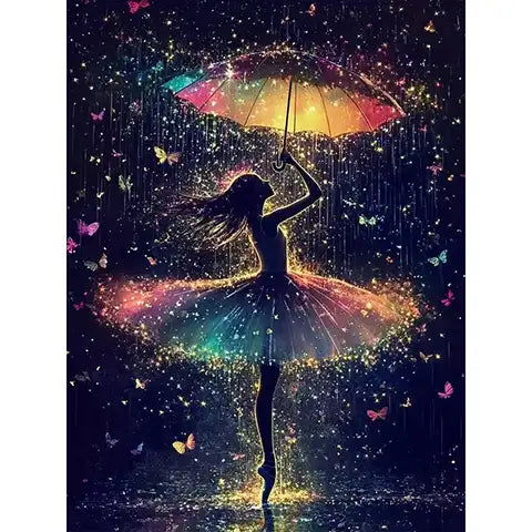 Sous la lueur de la nuit, une danseuse classique évolue gracieusement sous la pluie. Sa silhouette élégante, abritée sous un parapluie, semble flotter dans une atmosphère poétique et mystérieuse. Autour d’elle, une nuée de papillons lumineux tourbillonne, illuminant la scène de leurs reflets enchantés.