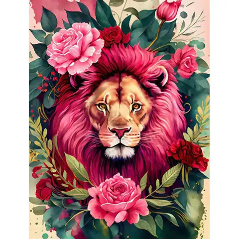 Un lion à la crinière de couleur rose à réaliser en kit de diamond painting