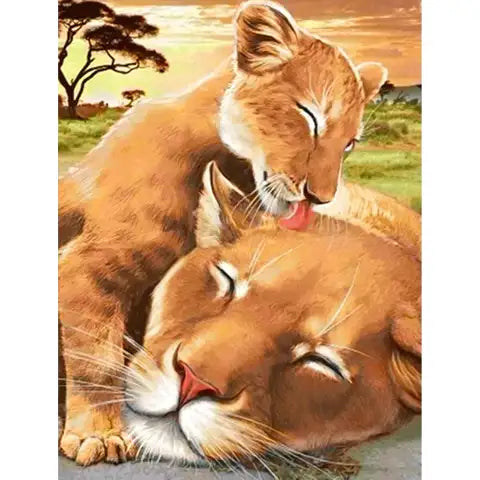 Laissez-vous transporter dans un univers d'amour maternel avec cette belle toile de peinture diamant. Le motif dépeint un moment tendre où le petit lion manifeste son affection en léchant doucement la tête de sa mère. Cette scène captivante symbolise le lien intime et protecteur entre une mère lionne et son petit. Une célébration visuelle du lien familial dans le monde animal.