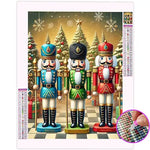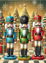 Trois figurines casse-noisettes se tiennent fièrement sur un élégant sol en damier festif. Leurs costumes colorés en bleu, vert et rouge évoquent la magie des fêtes traditionnelles. À l’arrière-plan, de majestueux sapins de Noël créent une ambiance chaleureuse et féérique. Une fois réalisé, ce tableau diamant illuminera l’esprit des fêtes et éveillera des souvenirs d’enfance joyeux et brillants.