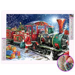 Le train du Père Noël rempli de cadeaux s’illustre sur cette broderie diamant
