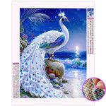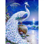 Un paon blanc majestueux se dresse fièrement, contemplant l’immensité d’une mer silencieuse. Son plumage scintille sous une lumière céleste aux reflets presque irréels. La scène baigne dans une nuit profonde, illuminée par des reflets magiques sur l’eau d’une mer calme. Une création à remplir de strass 5D en vous aidant des accessoires présents dans votre kit.