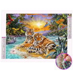 Famille de tigres dans un paysage paradisiaque en kit de diamond painting