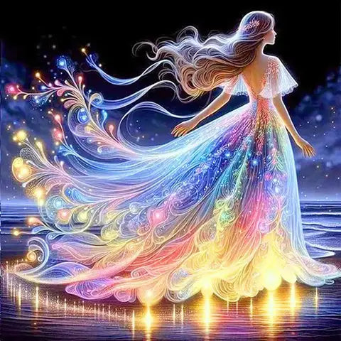 Sur cette toile, une femme se tient gracieusement au bord de la mer, vêtue d'une longue robe. Les lueurs magiques glissent sur le sable mouillé, créant un contraste captivant sous le ciel obscur. Sa silhouette occupe majestueusement la scène, laissant apercevoir au loin quelques vagues discrètes.