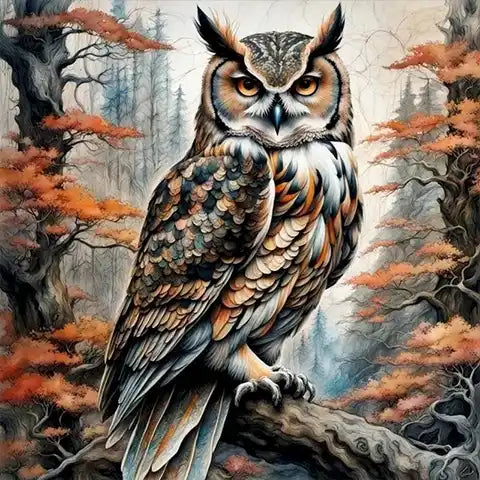 Un hibou majestueux est représenté perché fièrement sur la branche d’un arbre forestier. Les arbres environnants exhibent un feuillage d’automne aux teintes sobres, donnant un décor apaisant. Une partie du plumage du hibou reprend ces couleurs nuancées, offrant une harmonie visuelle naturelle.