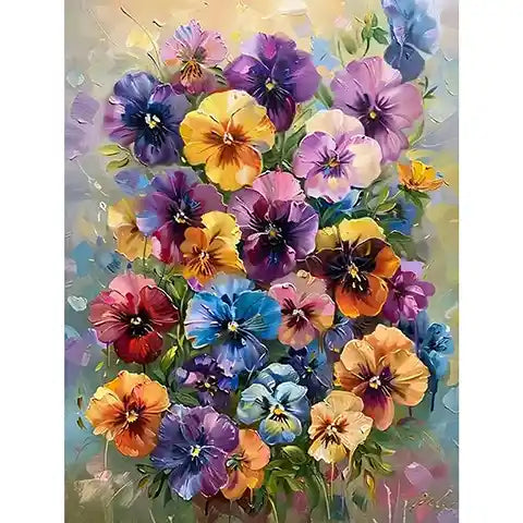 Une délicate composition de pensées déploie des couleurs subtiles, rappelant une véritable peinture classique. Les pétales se fondent dans des nuances douces, offrant une sensation de calme et de sérénité. Cette scène florale prend forme sous les doigts en y plaçant les strass petit à petit.