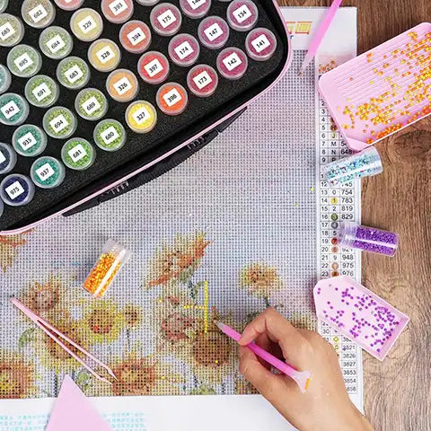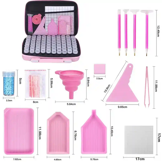 Notre valise de transport rose pour diamond painting est idéale pour les passionnés qui souhaitent organiser et emporter leurs diamants partout avec eux. Conçue pour un rangement optimal, elle possède des flacons transparents maintenus par une mousse.